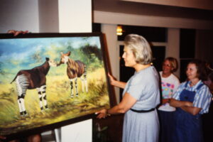 There were many missionaries and their families in Zaire. Melissa sent a truck with armed guards (not soldiers) to the Methodist Presbyterian hostel in Kinshasa to pick up those missionaries and their families and take them to the Baptist missionary compound. However, the driver got confused and delivered the Methodists, numbering roughly thirty people, to her home, which was the large residence for the US Ambassador near the Congo River. Melissa was surprised but being “extremely gracious and unflappable”, in the words of one of them, took them all into her living room. These families were so grateful that, at the end of their stay, they gave Melissa a painting of an Okapi, which had been at their hostel, with all their signatures on the back. She kept this painting for years on the wall of her home until she died. The painting is now at the home of a Methodist reverend in the US.
