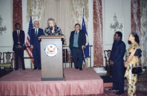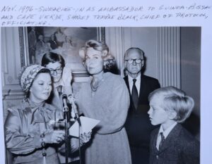 Melissa was sworn in as Ambassador in Washington in a ceremony attended by her family and authorities from the two countries. This would be her first of four swearing-ins, always at the State Department building and always with her family present. Shirley Temple Black, who used to be a famous actress when she was a child, was the official in charge of the swearing-in. Larry Eagleburger, the acting US Secretary of State, joked that, thanks to Melissa’s excellent swimming abilities, the government would save on travel between Cape Verde and Guinea-Bissau.