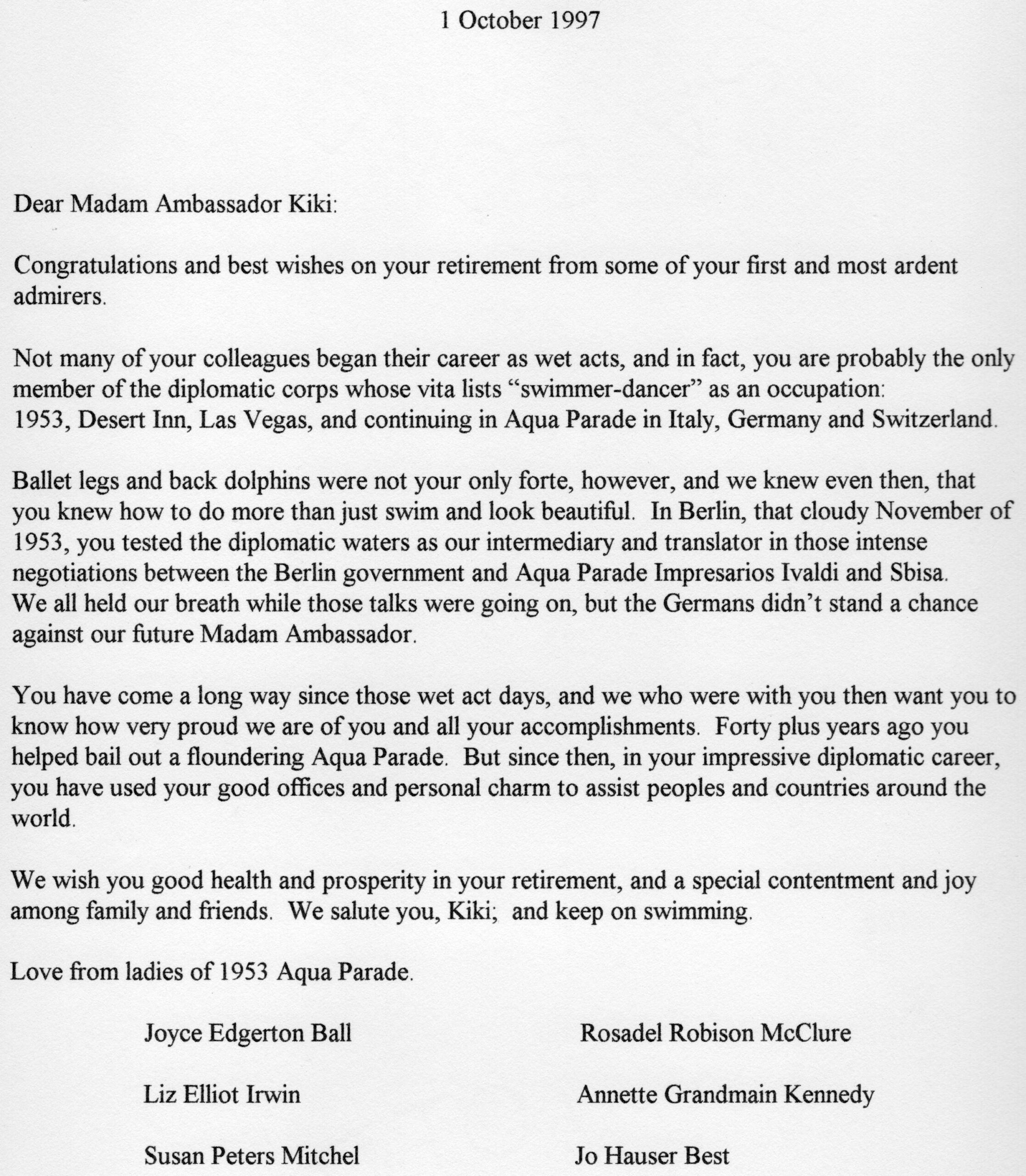 She maintained contact with her Aqua Parade friends for the rest of her life. When she was planning on retiring in 1997, they sent her a letter of congratulations.